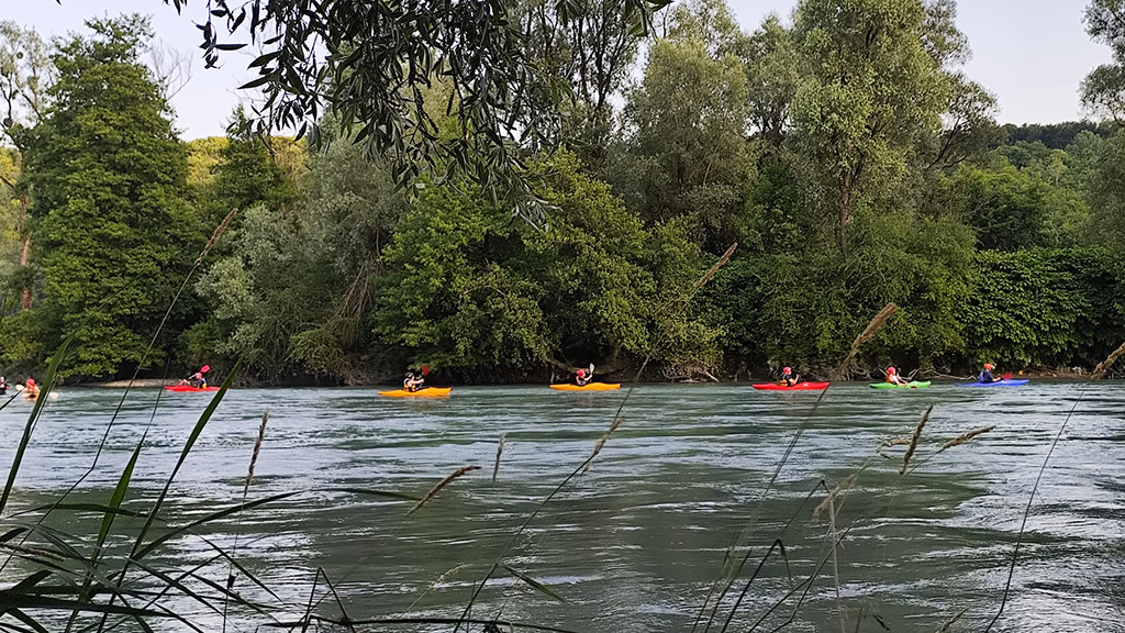 Depuis l’eau, la ville disparaît, presque. Les rives sont celles du héron cendré, du comoran, des grèbes et parfois aussi du castor qui laisse ses traces dans l’écorce tendre des saules. Par endroits on trouve d’anciens débarcadères, de petites échelles rouillées pour reprendre pied : signes que la ville n’a jamais tout à fait quitté le fleuve. Au-dessus de la canopée, les grands ensembles d’Onex et les tours du Lignon surgissent par moments, rappelant leur proximité.