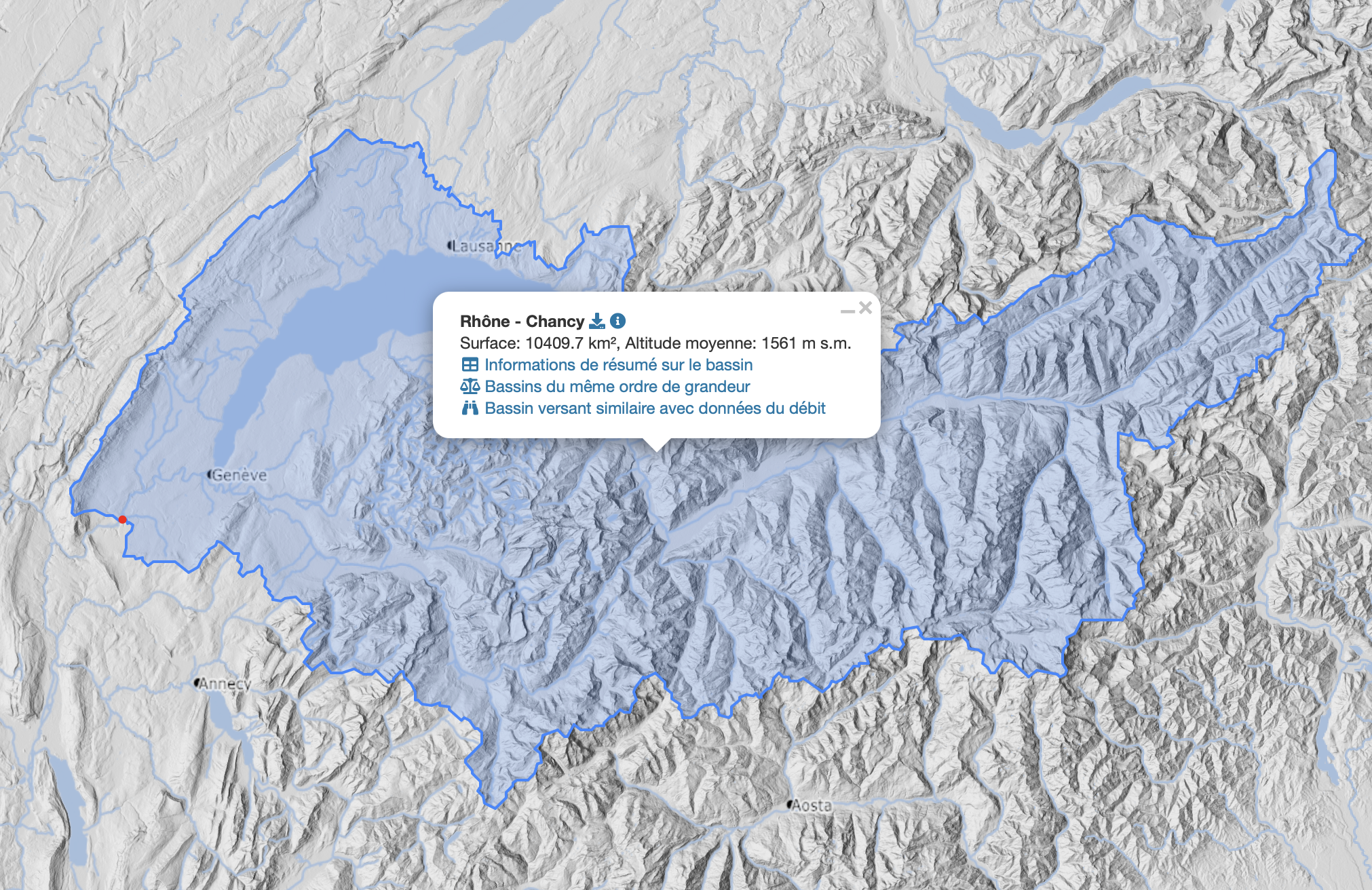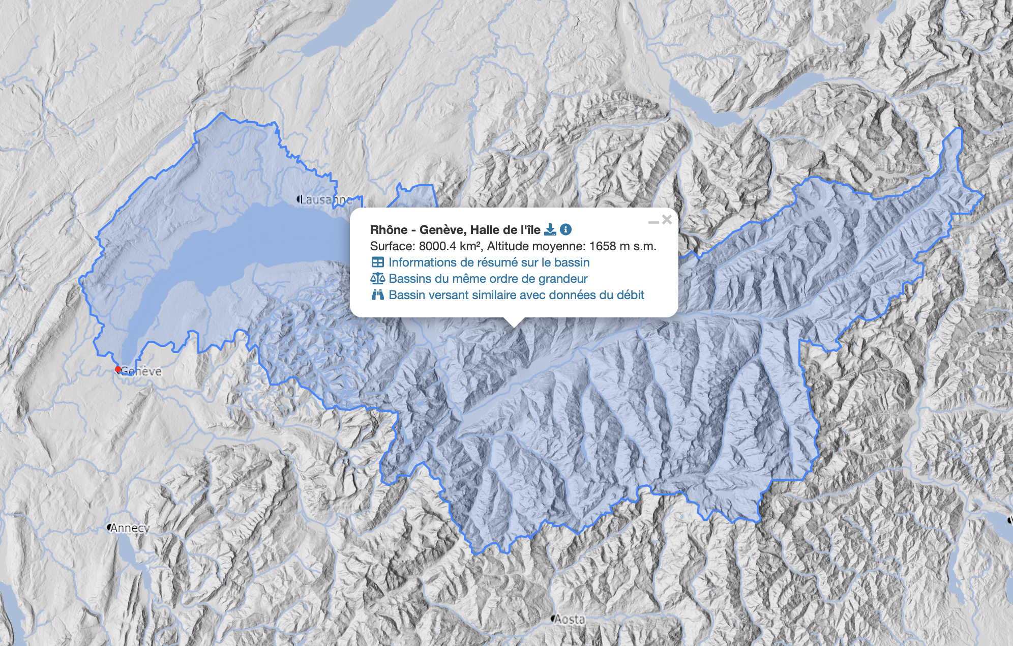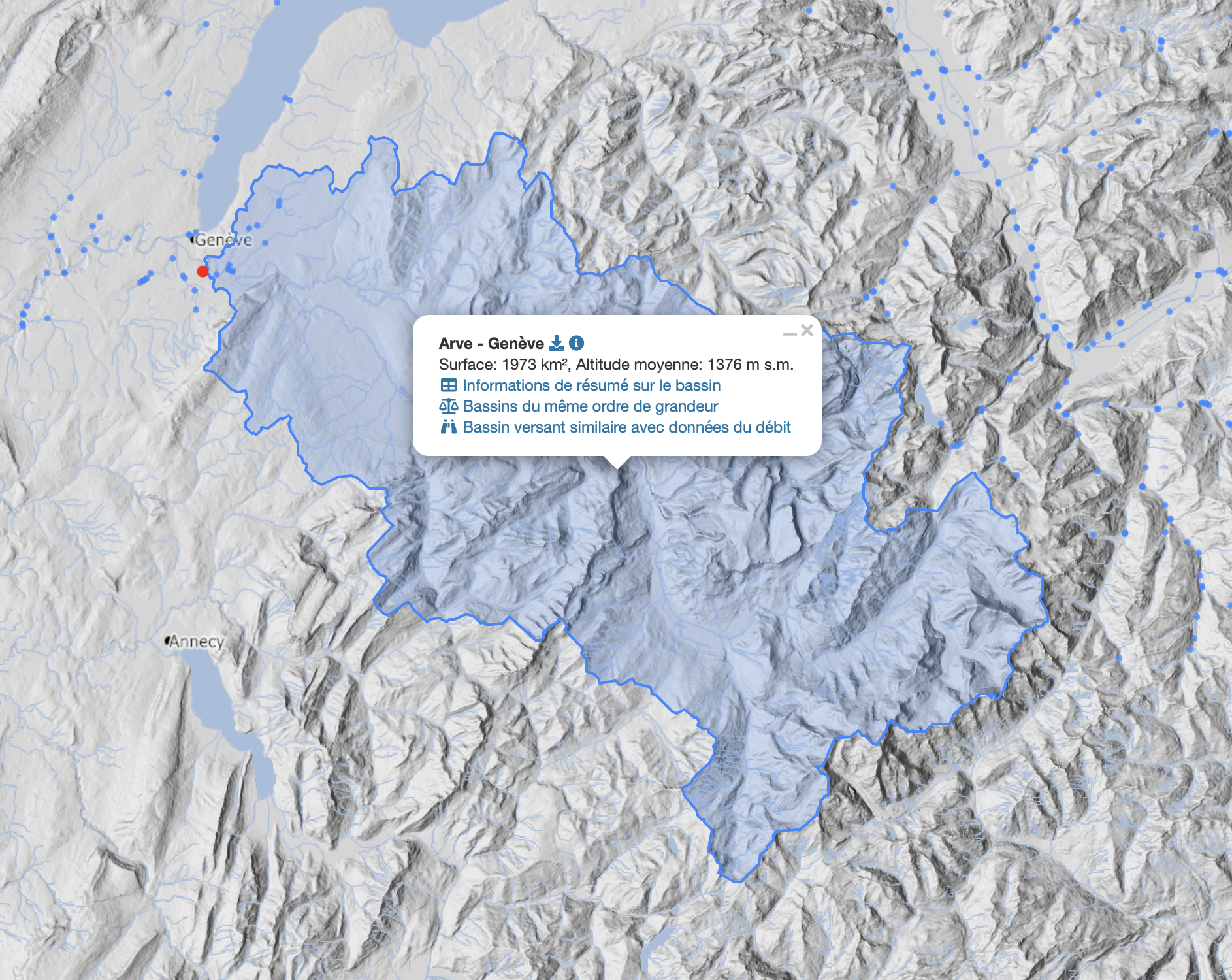 Le bassin genevois s’inscrit dans le bassin versant du Rhône, né dans les Alpes valaisannes et responsable de 85 % de l’alimentation du Léman. À Genève, le Rhône affiche un débit moyen de 251 m³/sec, avec des crues pouvant excéder 700 m³/sec, tempérées par la capacité de stockage du lac.