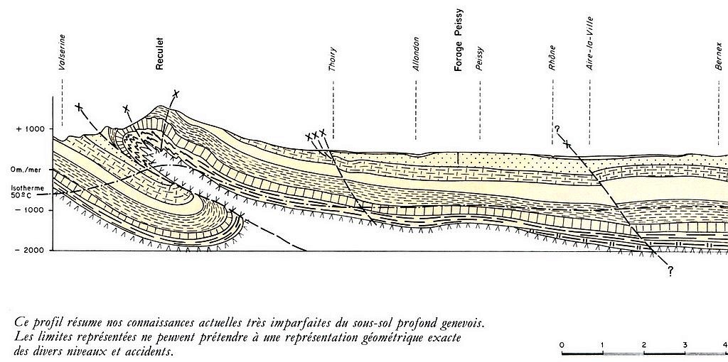 Les coupes géologiques du tronçon genevois montrent la succession des dépôts glaciaires reposant sur la Molasse. Par exemple, la Moraine basale supérieure, visible sur le haut des falaises de Saint-Jean, s’abaisse et passe sous le Rhône et le Quai de Seujet à hauteur du Pont Sous-Terre.